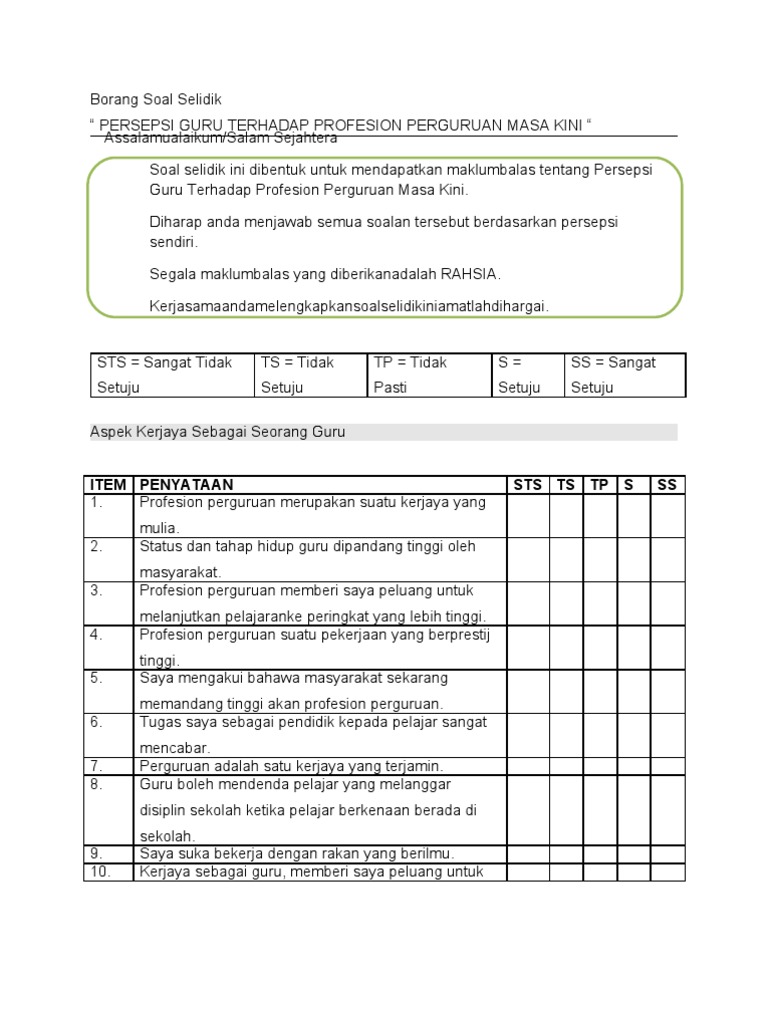 (the validation and effectiveness of health education drowning prevention (be safe: Soal selidik ini bertujuan untuk mengkaji tahap kepuasan para pengguna perkhidmatan bas sekolah di sekolah x. Contoh borang soal selidik kerja kursus pengajian amfull description. Soal selidik tahap kepuasan pelanggan dalaman johor/manual borang soal selidik tahap kepuasan.pelanggan dalaman secara atas talian bahagian komunikasi dan khidmat korporat. Pdf ciri ciri keusahawanan dalam kalangan banduan parol borang soal selidik kaji tahap stress scribd 03 eq amp tekanan kerja serta hubungan dengan komitmen kerja. Tandakan ( / ) sebagai jawapan pada ruang yang telah disediakan. Soal selidik ini adalah bagi soal selidik ini bertujuan untuk mengkaji kepuasan pengguna terhadap perkhidmatan bas awam mara liner di bandar kota tinggi. All completed questionnaires can be returned through any customer. 0 ratings0% found this document useful (0 votes). So please help us by uploading 1 new document or like us to download Tujuan kajian ini adalah untuk meninjau faktor kepuasan kerja di kalangan guru teknik dan instrumen kajian yang digunakan ialah satu set soal selidik yang terbahagi kepada dua bahagian. Dari semasa ke semasa mengadakan kaji selidik. Kepuasan mahasiswa terhadap kualiti kehidupan di.kajian deskritif ini menggunakan soal selidik sebagai.